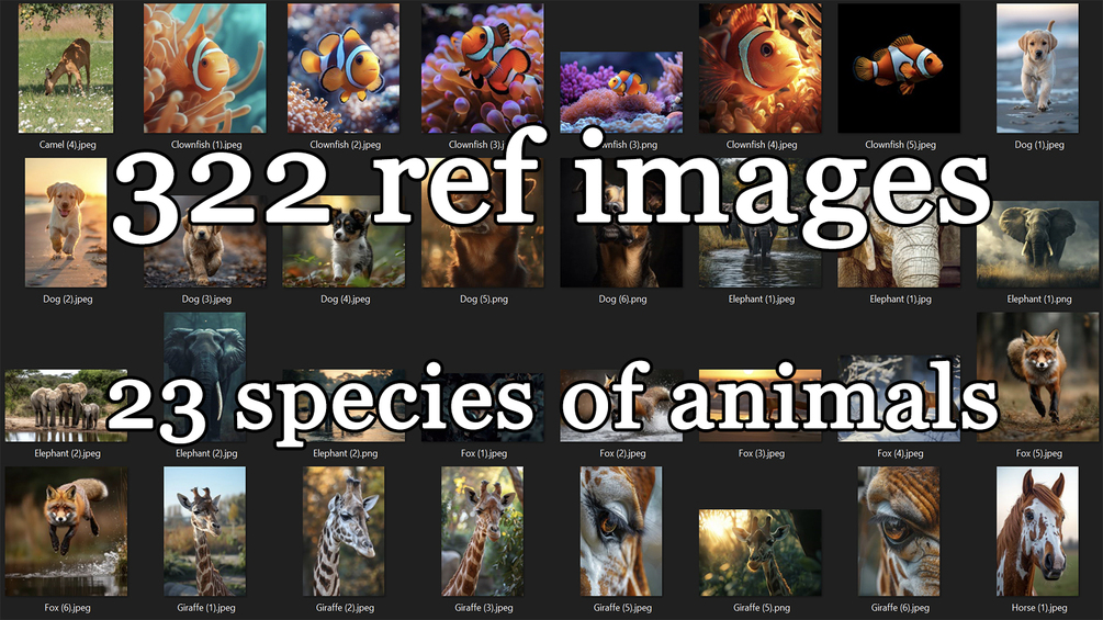 Bear 16 Bison 18 Dog 28 Elephant 13 Fox 10 Giraffe 29 Horse 28 Kangaroo 13 Camel/Llama 22 Mouse 11 Pig/Boar 18 Reptiles 18 Sheep/Goat 12 Squirrel 20 Clownfish 6 Jellyfish 17 Lionfish 9 Orca 13 Shark 10 Zebra 11